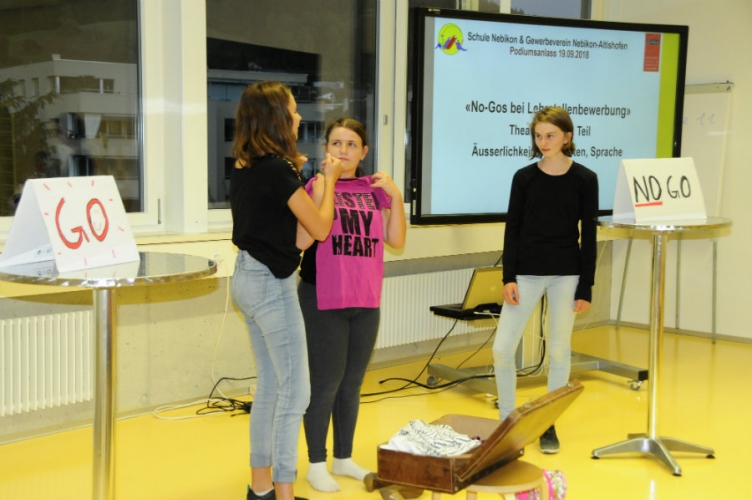 Ein bauchfreies T-Shirt, moderne zerrissene Hosen und als Tüpfchen obendrauf eine glitzernde Sonnenbrille. Perfekt für ein Bewerbungsgespräch für die Lehrstelle? Nein, es ist ein absolutes No-go. Dies zeigten die drei Nebiker Sekundarschülerinnen Camille Fournier, Natascha Müller und Aline Wiss den anwesenden Eltern und Jugendlichen. Die drei Mädchen demonstrierten in den mit Lehrerin Regula Wyss eingeübten Szenen witzig und gekonnt, was bei einem Bewerbungsgespräch geht und was nicht.