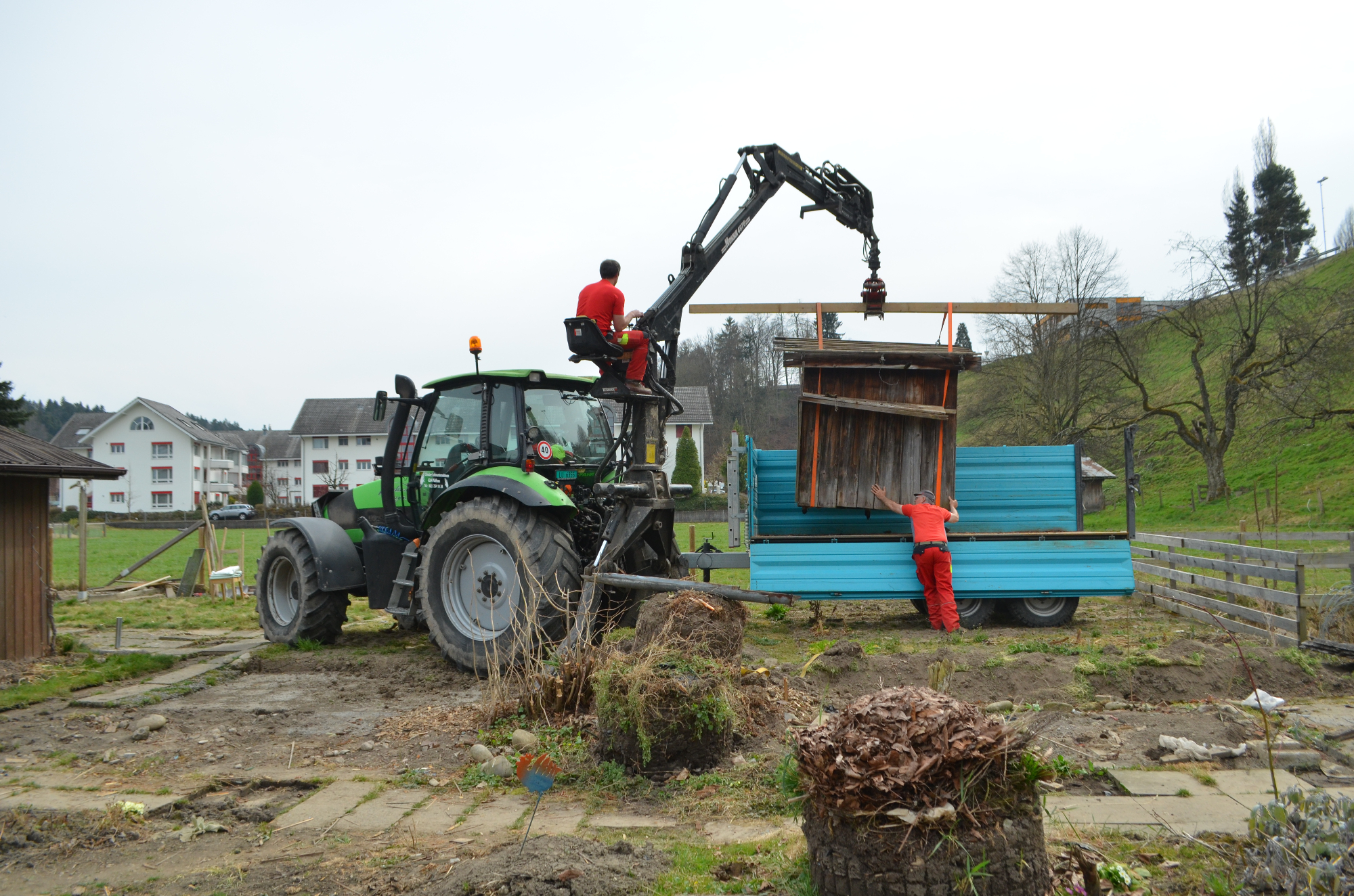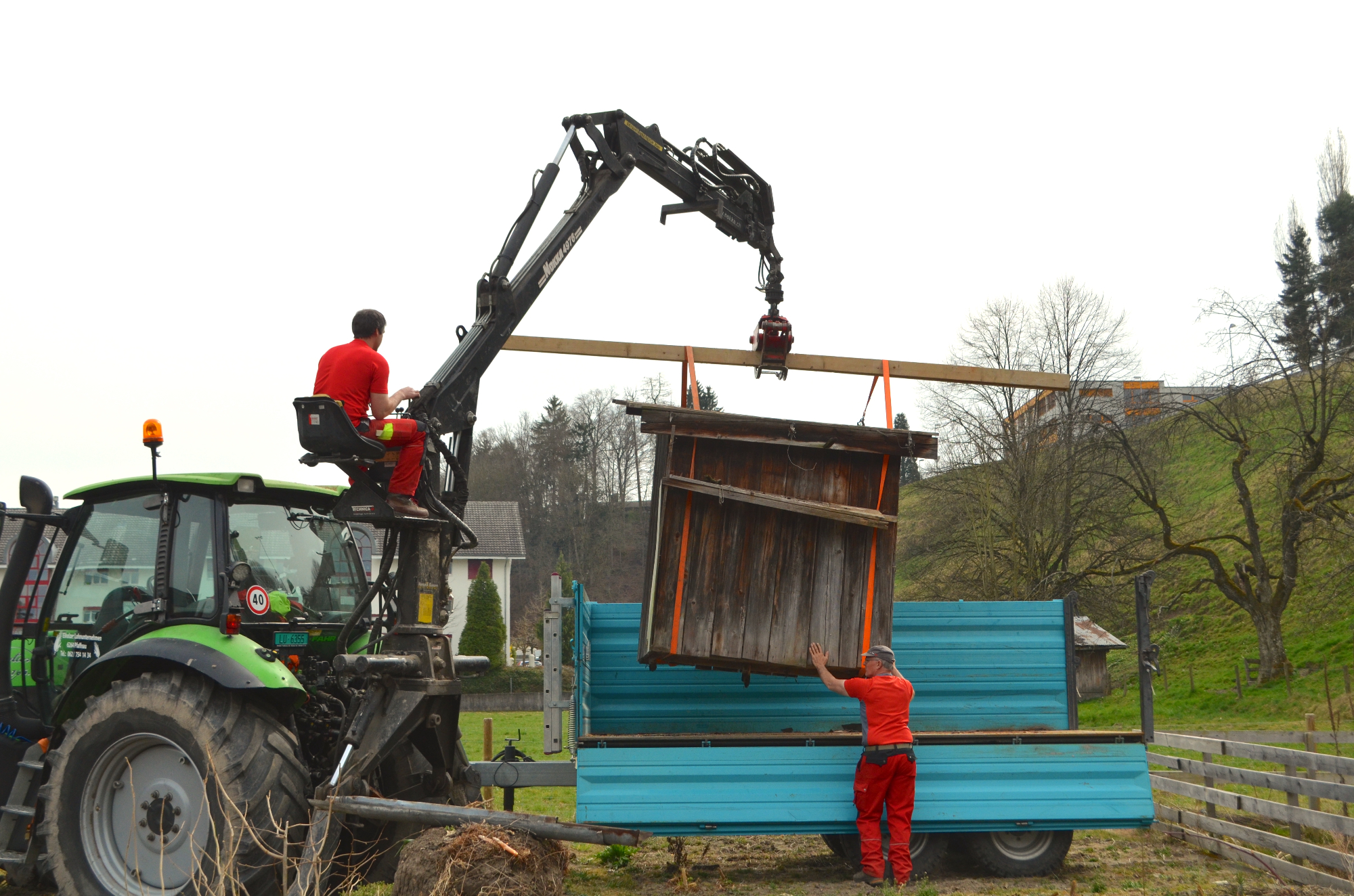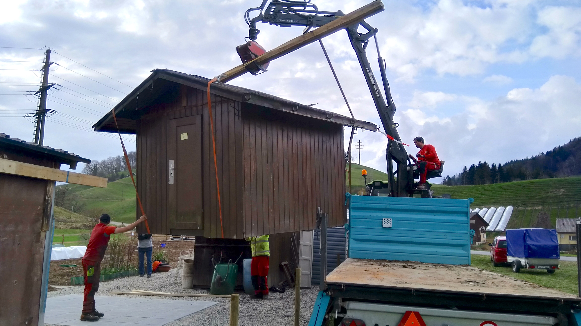 In den Bünten fährt ein Traktor der Korporation Willisau vor. Die hölzernen Gartenhüsli der Vereinsmitglieder werden in die Käppelimatt chauffiert. «Eine knifflige Angelegenheit, da viele Häuschen schon irgendwo etwas baufällig sind», berichtet Klaus Marti, Vorstandsmitglied der Gartenfreunde. Tatsächlich müssen die beiden Forstmitarbeiter viel Sorgfalt dafür aufwenden, das Häuschen mit den Spanngurten am Kran zu befestigen, zu heben und schliesslich behutsam wieder auf dem Anhänger abzusetzen. Zum Abladen geht es an den neuen Standort, nach Willisau-West, in die Käppelimatt.