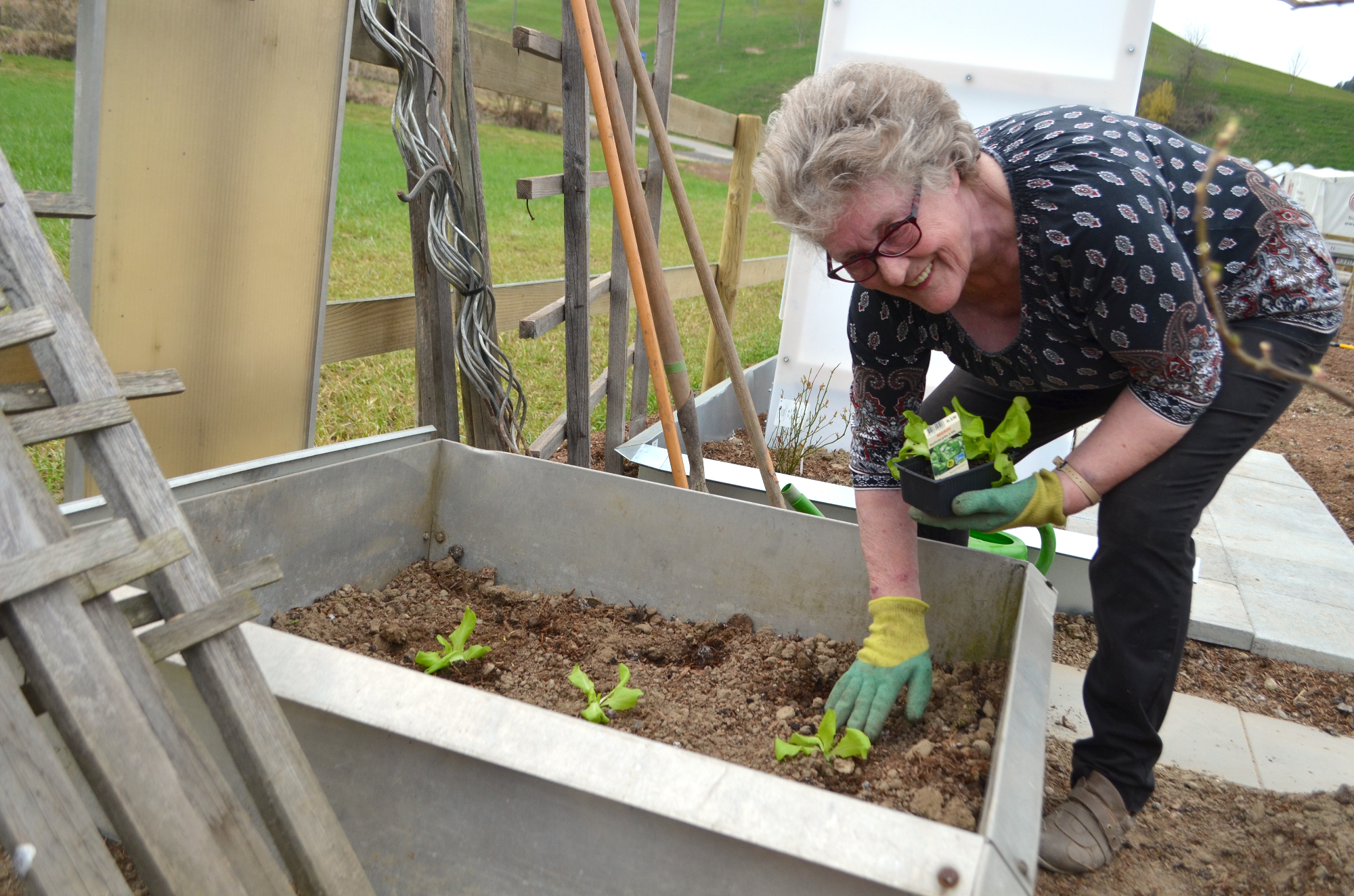 Dort haben Edith Spiess, Präsidentin des Vereins Gartenfreunde, und ihr Mann Aldor Spiess, bereits ganze Arbeit geleistet: Die Sommer- und Herbst-Himbeer-Stauden sind gesetzt, ebenso die Rosensträuche und vieles mehr, das noch unter der Erde auf seine Zeit wartet. Aldor Spiess montiert die Fenster ihres Gartenhäuschens, welches bereits am Vortag gezügelt wurde. Edith Spiess pflanzt Salatsetzlinge in das kleine «Treibhaus» am Ende ihrer Beete. «Es soll ja jetzt wieder kälter werden, deshalb kommen die Salate hier rein.» Von Hand gräbt die 72-Jährige die Löcher, in die sie vor dem Anpflanzen schon mal etwas Wasser füllt. «Das ist ein guter Trick, wenn man verhindern will, dass die Wurzeln verklumpen», erklärt Spiess mit einem Augenzwinkern. Und sie muss es wissen: Seit Kindsbeinen steht sie im Garten, zuerst in jenem der Mutter, danach hatte sie ihr eigenes Reich – in den Willisauer Bünten. 50 Jahre lang habe ich da gewirkt, erzählt sie. Zeitweise liefen 44 Beete unter ihrem Namen, wobei sie einige davon noch «untervermietet» hatte. Ein eigener Garten: Der gehört für Edith Spiess «einfach dazu». Sie sagt: «Grabe ich in der Erde, vergesse ich die Zeit.»