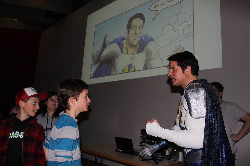 Im Rahmen der Projektwoche «Mit de Hand öpis guet chönne» hat die Schule Willisau einen Superhelden mit Zauberhand eingeladen. Bionicman erzählt den Kindern aus seinem Leben mit nur einer Hand und zeigt ihnen auf, dass in jedem Menschen Superkräfte stecken.