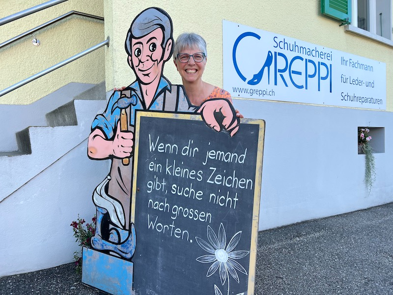 Allmonatlich immer wieder andere sinnige Zitate und Sprichwörter: Solche sind seit über einem Vierteljahrhundert vor der Nebiker Schuhmacherei Greppi auf einer Stellwand zu lesen. Der WB traf die Schreiberin.